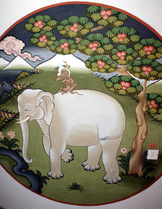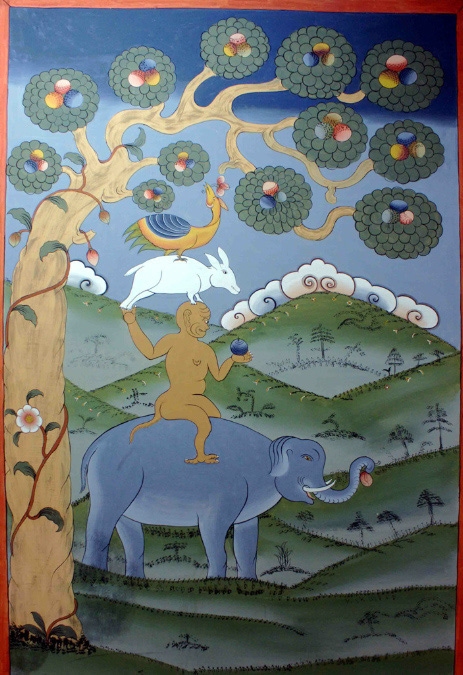 Was wir noch von den Bildern in den Klostern oder Dzongs lernten, war die gezeichnete Geschichte der vier Freunde, die den Baum gepflegt und gehegt hatten und nun alle in den Genuss der Früchte kommen sollten. Der Elefant wässert den Baum, der Hase bewacht ihn, der Affe düngt ihn, der Vogel verbreitet die Samen. Sie haben sich zusammengefunden und erreichen gemeinsam die Krone mit den Früchten. Wir standen in dem handycraft shop vor diesem Bild, kauften aber eine Maske, eine Tigermaske. Die Tigermaske ist das Symbol des Herrschers über die Tiere und ist Symbol der Dominanz. Hand made in Bhutan. Die Kaufentscheidung fiel erst, als Toma auch zusagte, die Maske im Wohnzimmer aufzuhängen. |