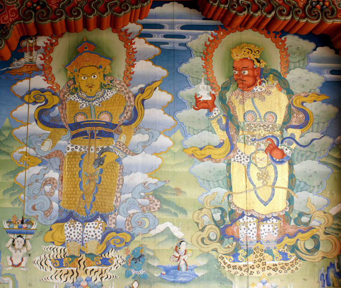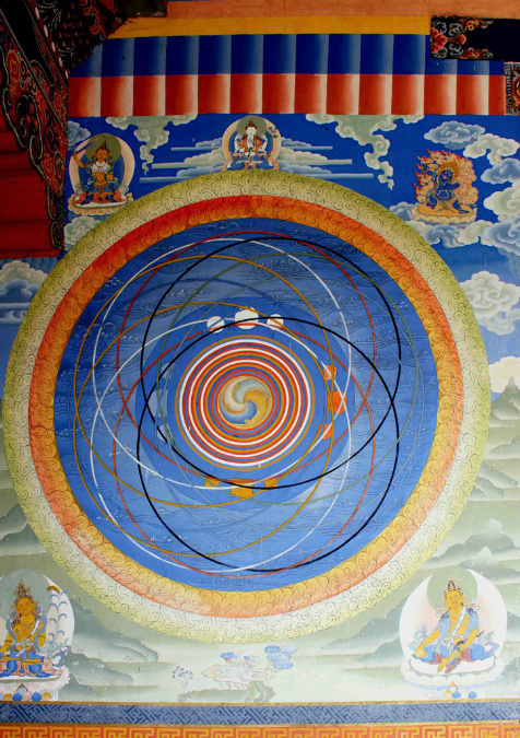 Hier erklärte er uns ein kosmisches Mandala. Die verschiedenen Farben bedeuten: Die Götter der Himmelsrichtungen sind: Blau – Wasser Norden – mit Schwert - Kriegsgott Grün - Umgebung Osten – mit Zitter, Laute – Gott der Musik, Muse Rot - Feuer Süden – Mungo mit Perle - verkörpert Reichtum Weiß – Himmel, Luft Westen – Schlange / Stupa – Religion/ Seele Gelb – Erde