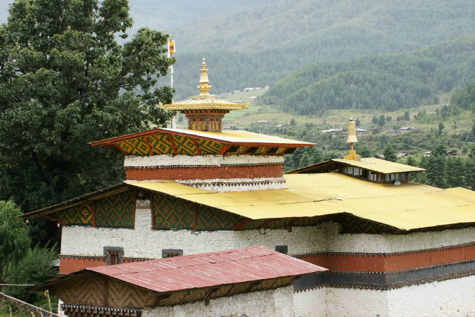 also spelled Jampey Lhakhang or Jampa, is located in Bumthang (Jakar) in Bhutan, and is said to be one of the 108 temples built by Tibetan King Songtsen Gampo in 659 AD on a single day, to pin down an ogress to earth forever. It was divined that the supine demoness was causing obstruction to the spread of Buddhism, and temples were constructed on her body parts that spread across Tibet, Bhutan and the borderlands. The best known of these temples are Jokhang in Lhasa, Kichu in Paro and Jambay Lhakhang in Bumthang. Other lesser known temples in Bhutan have been destroyed, but it is believed that among others, Kongchogsum in Bumthang, Khaine in Lhuentse and two temples in Haa may have part of these 108 temples. The temple of Jambay Lhakhang was later visited by Guru Rinpoche and later restored by Sindhu Raja after Guru restored his life force. It has been repaired and rebuilt several times over time. |