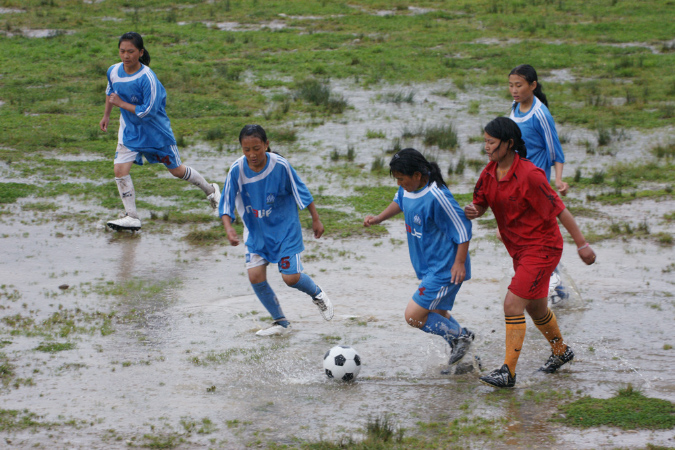 Vom Fenster des Shops, in dem wir uns wegen starken Regens längere Zeit aufhielten, sahen wir, wie unweit entfernt Fußball gespielt wurde. Fußball und Bhutan, das passt ja gut zusammen, gab es da nicht berühmte Filme. Wir sprachen die Bitte aus, zum Fußball zu gehen, und schon war sie erfüllt. Es waren junge Mädchen aus der Secondary School, die bei strömenden Regen, unbespielbarem Platz, mit Hingabe, Freude, Spaß ohne Zeichen von Missmut, Fußball spielten, mit vollem Einsatz, ohne sich zu schonen, obwohl der See (Platz) es äußerst schwierig machte, überhaupt Fußball zu spielen, den Ball über/durch den Schlamm, den Morast zu bewegen. Flache Bälle waren und sind auch nicht, über die Torlinie zu bekommen, da es nur eine gedachte Linie gab und der Elfmeterraum eine riesige Pfütze war, die Torfrau das ganze Spiel knöcheltief im Wasser stand und der Ball, wenn er vor dem Tor landete einfach liegen blieb.
