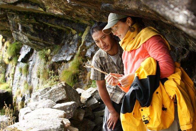 Beim Aufstieg auf die kleine Anhöhe kommen wir an einem Felsüberhang vorbei, der Nomaden als Nachtlager dient und finden hier einen Quirl, der bei der Herstellung von Buttertee verwendet wird. |