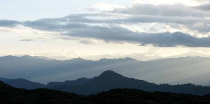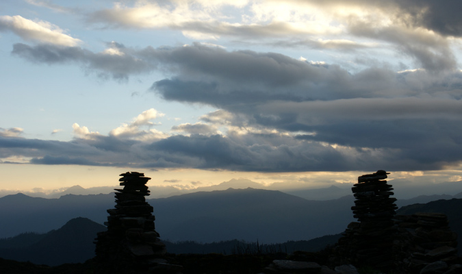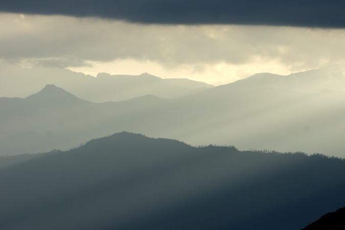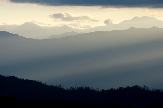 Wir haben viel Zeit und beobachten wie der Tag zur Neige geht. Es sind vorallem Blau- und Grautöne in denen die Berge am Horizont versinken. |